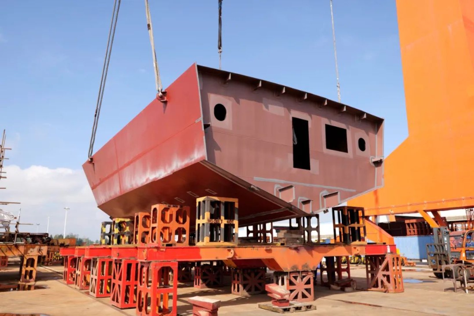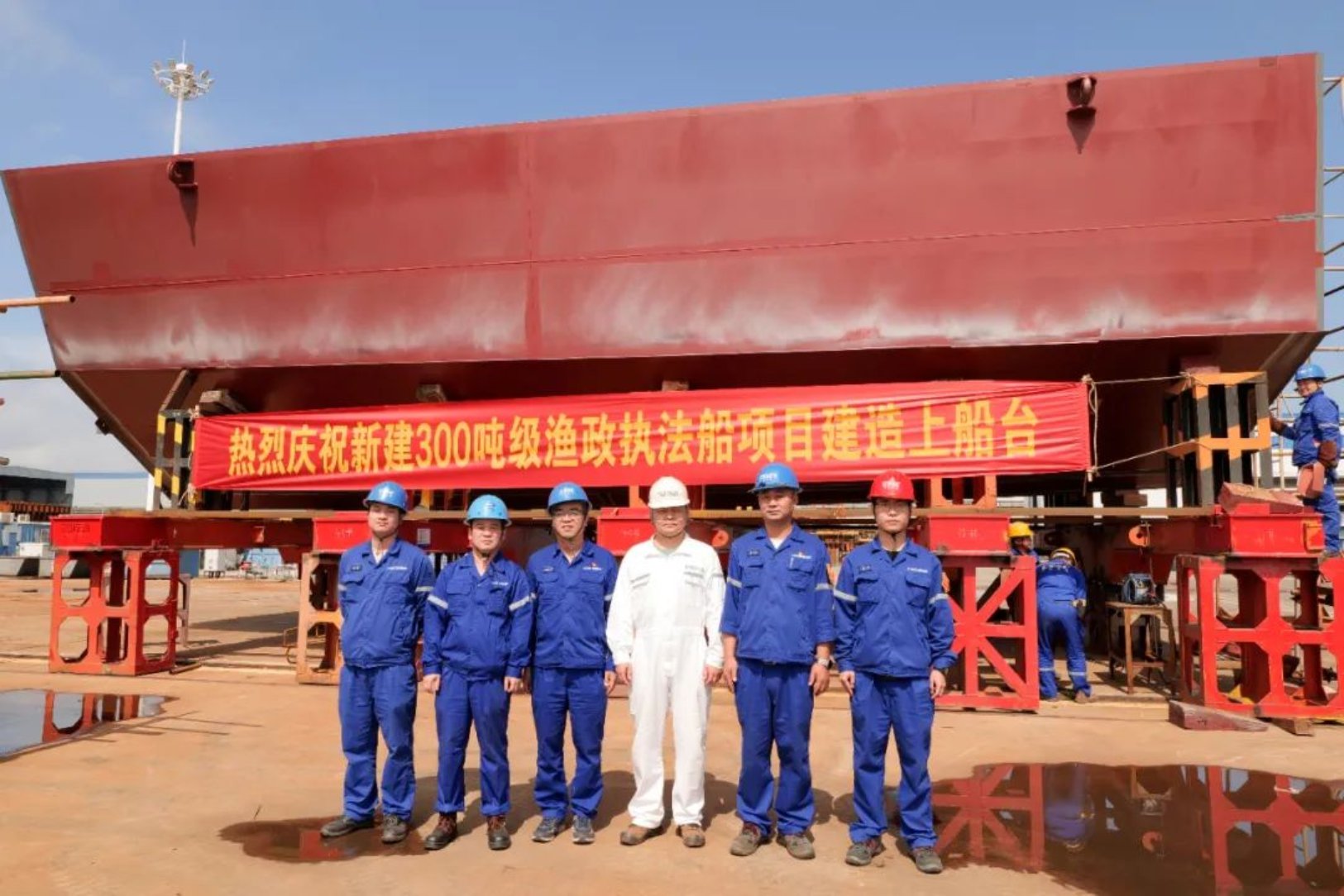 10月8日,由武昌造船為連云港市海洋與漁業綜合行政執法支隊打造的新建300噸級漁政執法船,在監理、項目三總師及參建單位相關負責人的見證下,順利上船臺,標志該船正式進入船臺搭載階段。