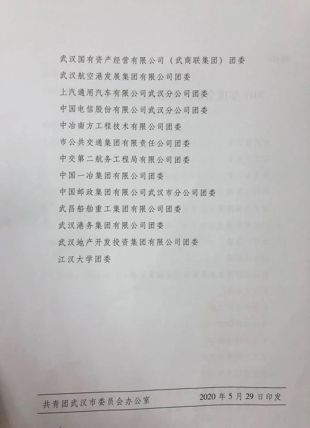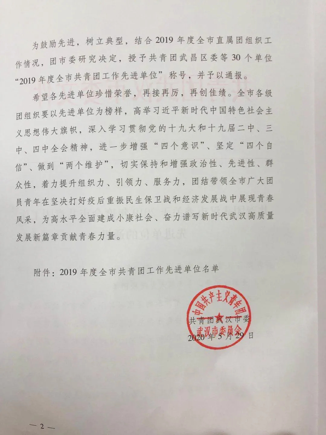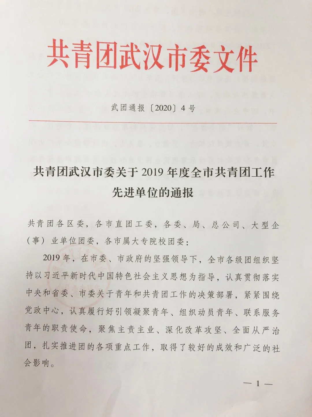 武船集團(tuán)團(tuán)委被授予2019年度武漢市共青團(tuán)工作先進(jìn)單位榮譽(yù)稱號(hào)。