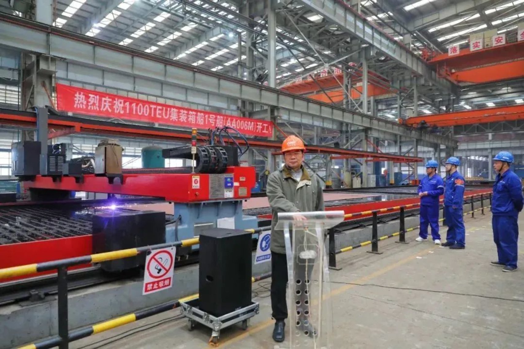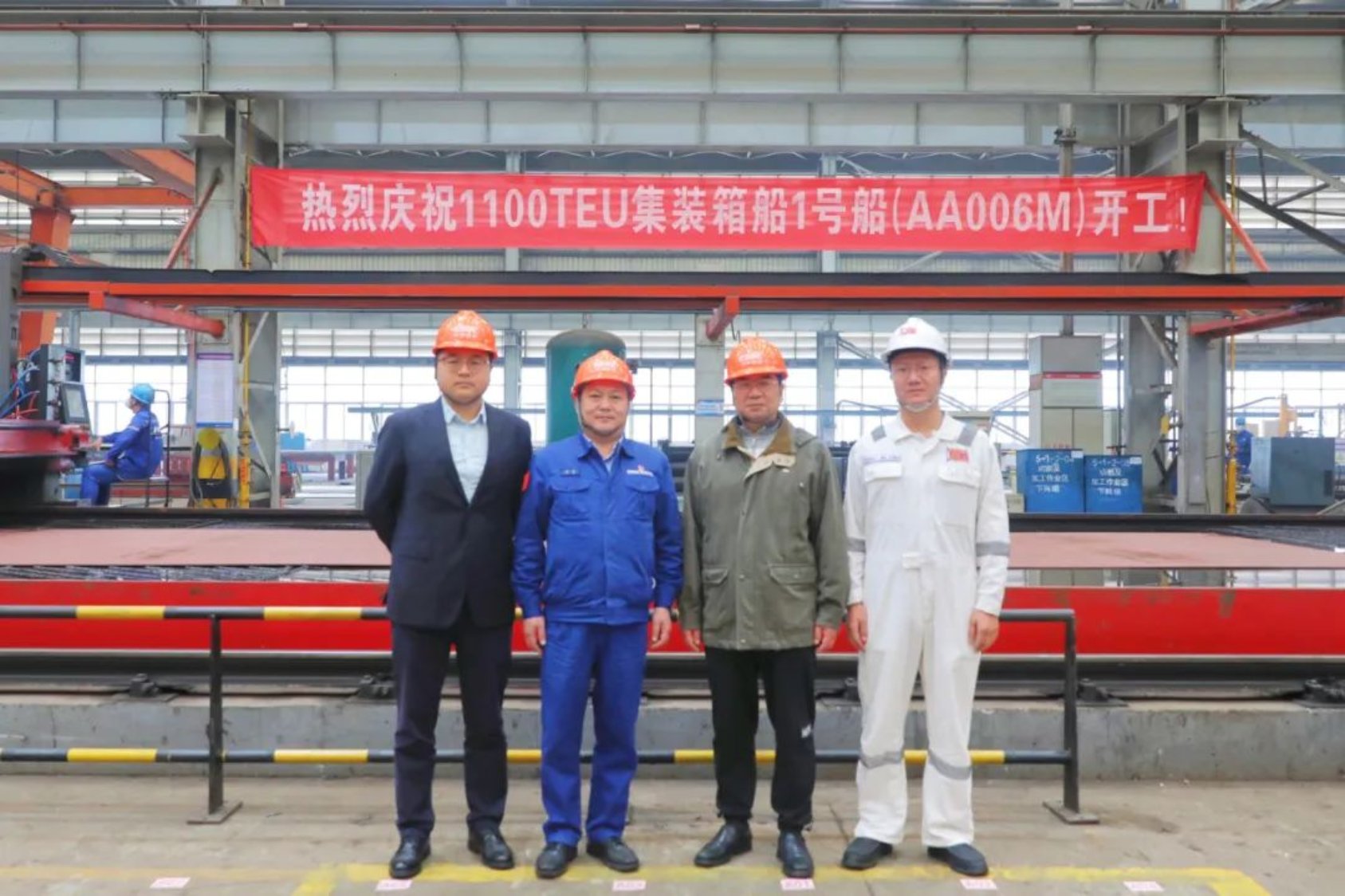 11月18日上午11時(shí)18分,中國船舶武船為CA Shipping建造的1100TEU集裝箱1#船項(xiàng)目在武船雙柳總部順利開工。