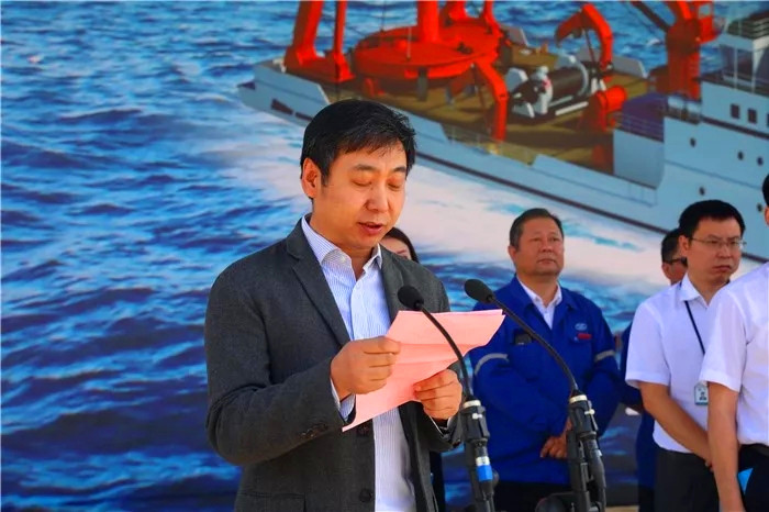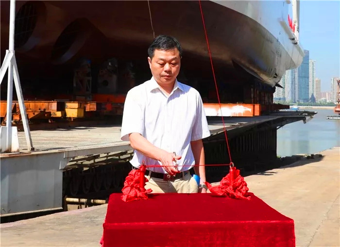 國家自然資源部海洋預警監(jiān)測司觀測處處長陳陟、國家海洋局東海分局副局長唐文勝、國家海洋局南海分局副局長謝健、國家海洋局北海分局副局長孫利佳、中國船級社武漢分社副總經(jīng)理余德斌、上海佳船工程監(jiān)理發(fā)展有限公司副總經(jīng)理王道順、中船重工第701研究所所長助理楊鐘、武船集團副總經(jīng)理王渭齡為下水剪彩。唐文勝行擲瓶禮。