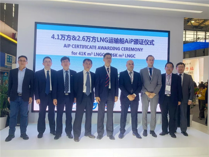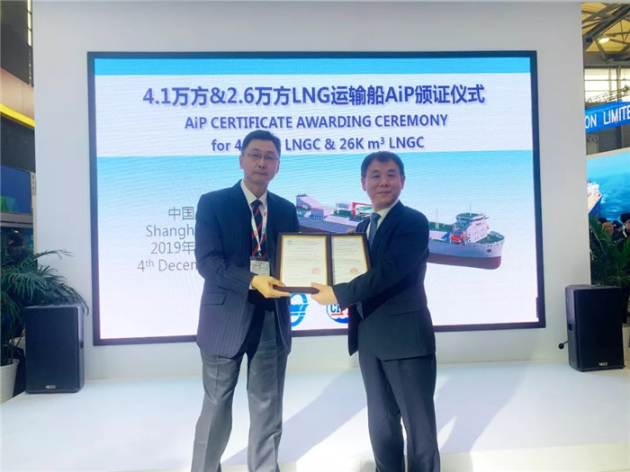 2019年12月4日,在第20屆中國國際海事展上,海工院研發的26000/41000立方米進江薄膜型LNG運輸船獲得了中國船級社(CCS)頒發的AiP認可證書。武船集團副總經理王渭齡代表武船集團接收證書,武船集團海工院董事長魏建平在頒證儀式上致辭,海工院副院長葉茂做船型介紹。