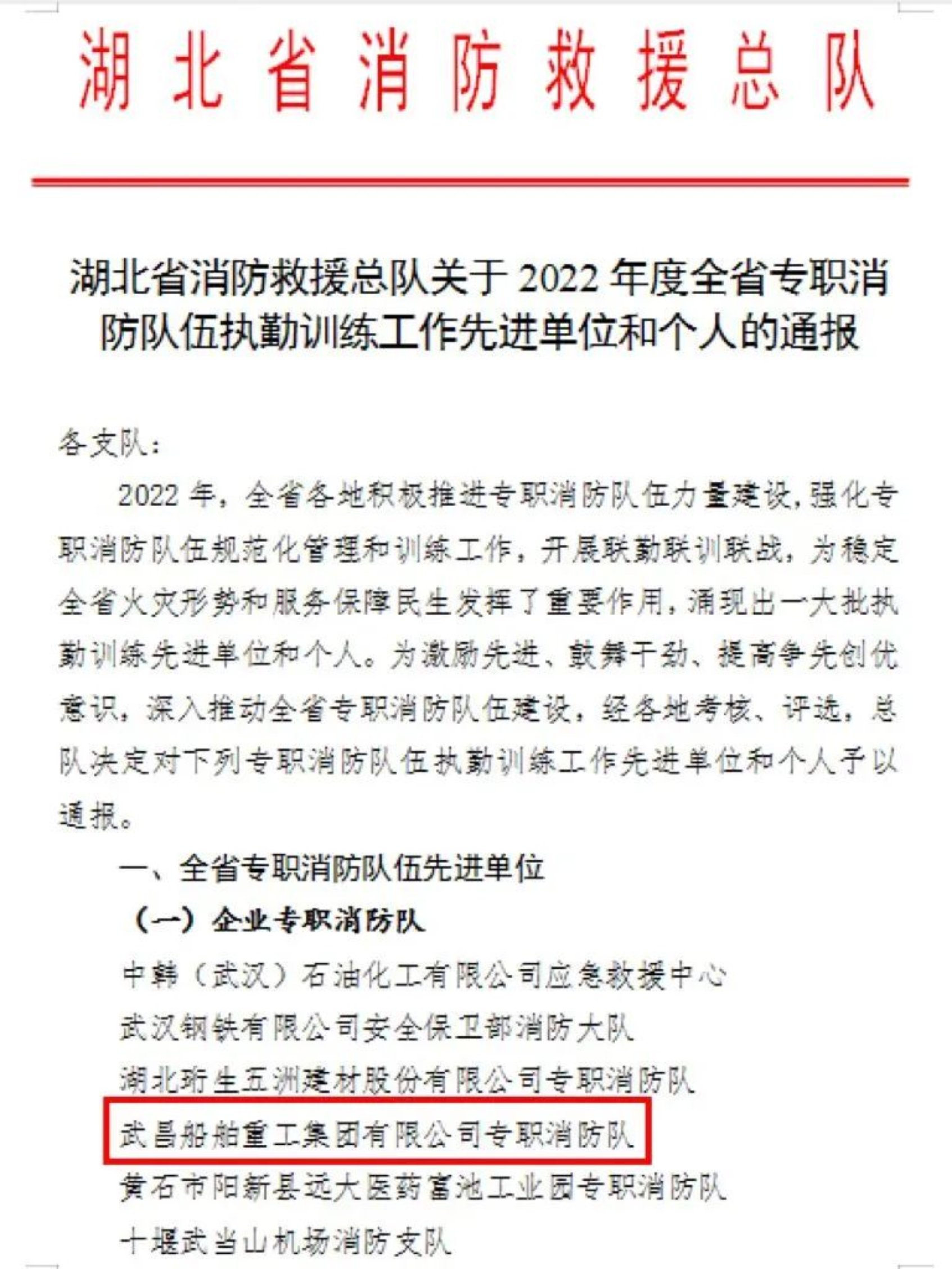 近日武昌造船專職消防隊獲得湖北省消防救援總隊授予的2022 年度全省專職消防隊伍執勤訓練工作先進單位榮譽稱號