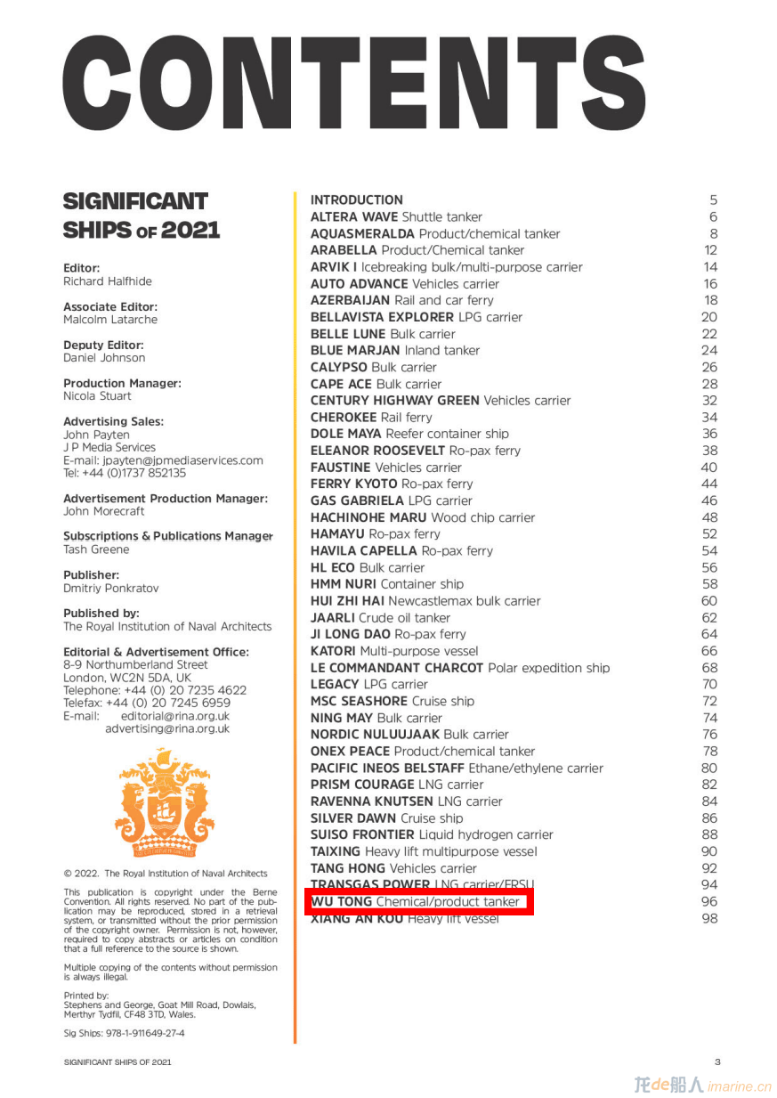 近日,英國皇家造船工程師協會發布了2021年度杰出船型名錄《SIGNIFICANT SHIPS OF 2021》,收錄了全球各船廠去年交付的43型杰出船型。其中,由中國船舶武船集團建造的7200載重噸雙相不銹鋼化學品船“梧桐”輪榮列其中。