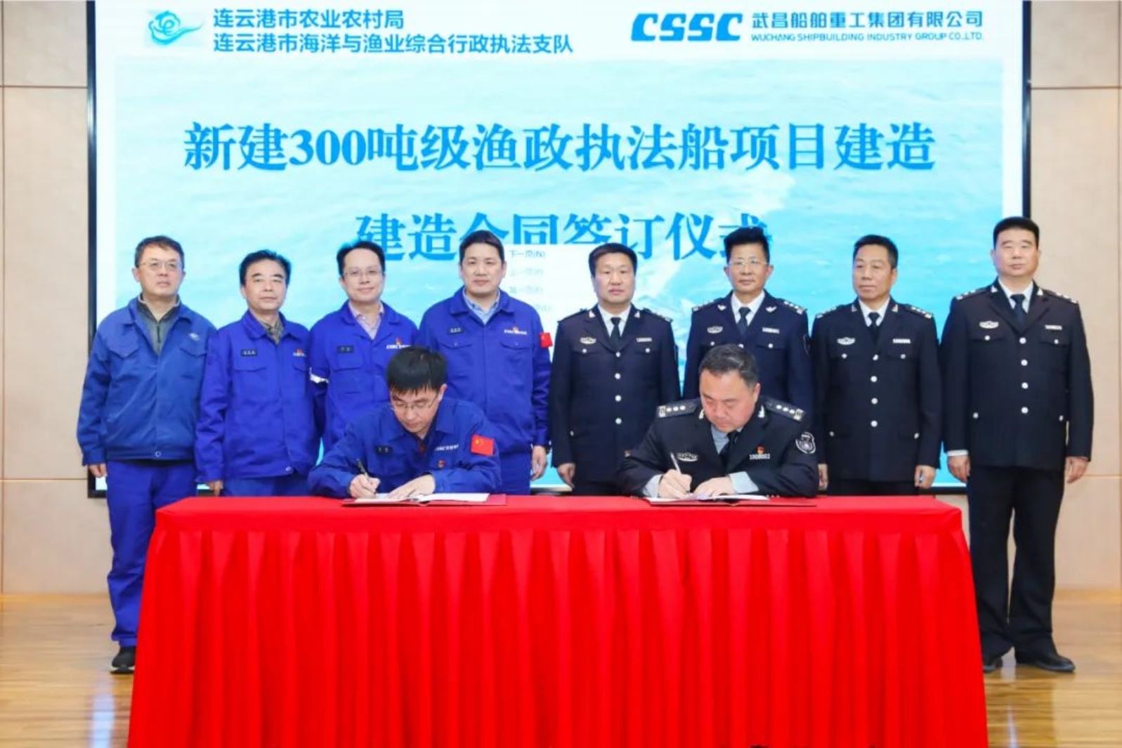 連云港市農業(yè)農村局副局長楊建瑞、連云港市農業(yè)農村局漁政處處長李海、連云港市海洋與漁業(yè)綜合行政執(zhí)法支隊支隊長張長春等領導,武昌造船黨委委員、總會計師陳仲明,經營部和船艇公司共同見證簽約。
