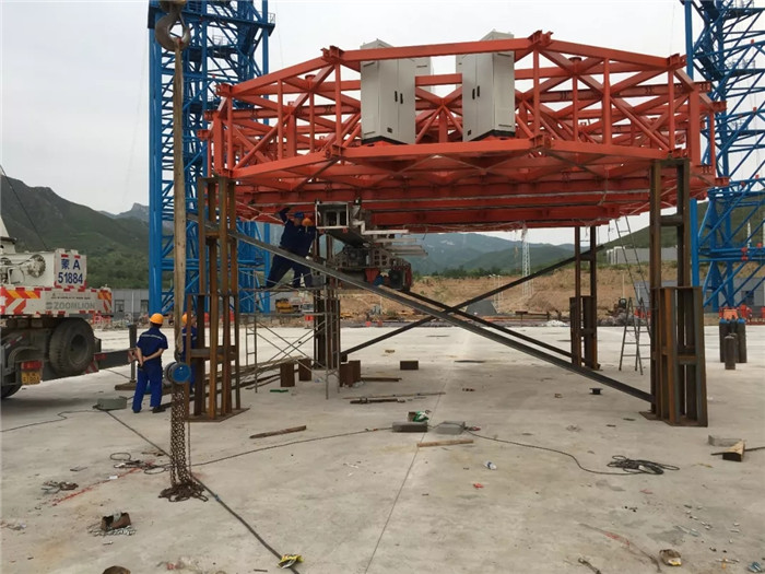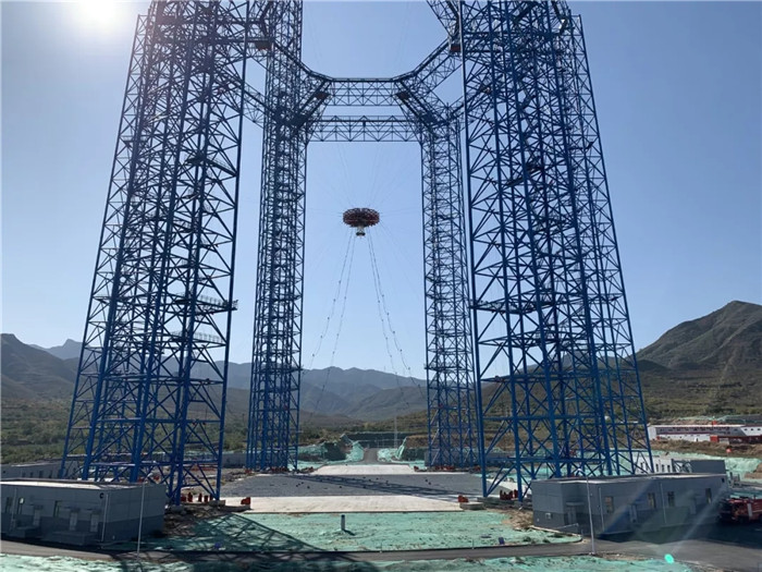 2019年6月,試驗(yàn)場(chǎng)6個(gè)鋼結(jié)構(gòu)塔架拔地而起,與之相匹配的共18套絞車設(shè)備、36根鋼絲和700余組(高空500余組、近地200余組)導(dǎo)向輪,以及相關(guān)配套電纜、電氣設(shè)備設(shè)施的安裝工作接近尾聲,待“隨動(dòng)盤”運(yùn)到,便可以開(kāi)始進(jìn)行總裝和調(diào)試工作。