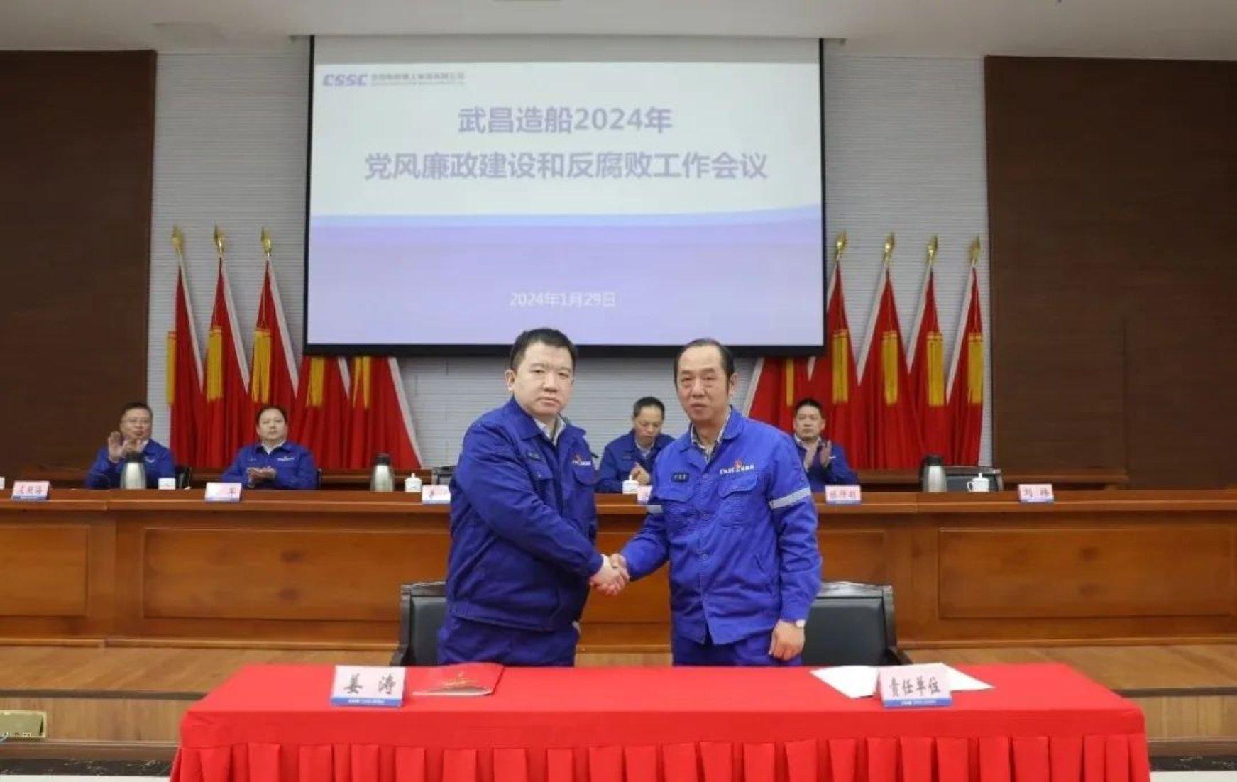 1月29日,中國船舶集團武昌造船召開2024年黨風廉政建設和反腐敗工作會議。武昌造船黨委書記、董事長姜濤出席會議并講話。黨委副書記、總經理梁師清主持會議,并傳達了二十屆中央紀委三次全會精神和集團公司2024年黨風廉政建設和反腐敗工作會議暨警示教育大會精神。黨委委員、紀委書記左照海作了題為《忠誠履職 擔當作為 以紀檢工作新質效助推價值創造 為公司改革深化提升 高質量發展提供堅強保障》的工作報告。公司領導田軍、陳仲明、劉祎,公司助理級領導、公司紀委委員,中層副職及以上管理人員參加會議。