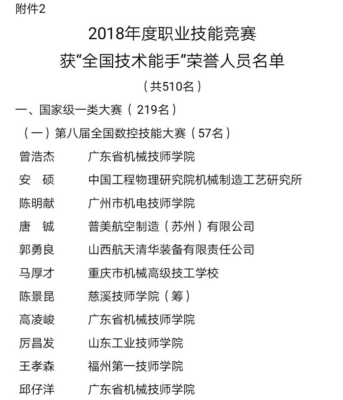 日前,人社部決定授予在第45屆世界技能大賽全國選拔賽和在2018年中國技能大賽中取得優異成績的選手“全國技術能手”榮譽,并頒發獎章、獎牌和榮譽證書。