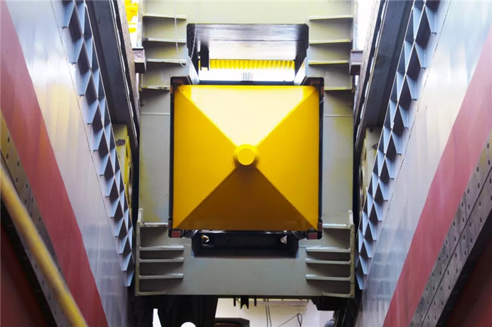 ▲通過與移船臺車方孔之間的微小間隙,巨型鋼樁與移船臺車實現高空精準交會對接;