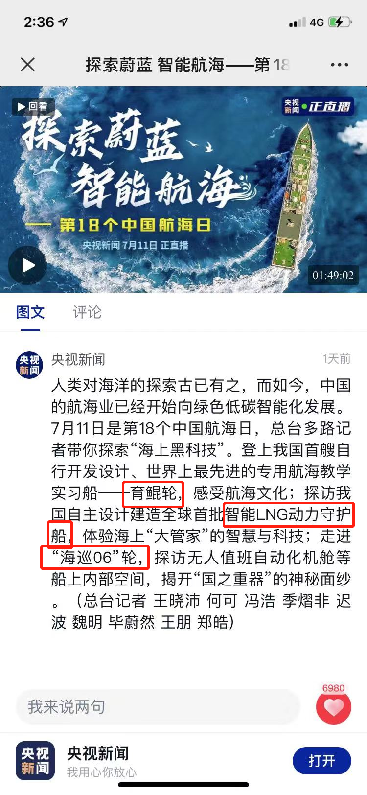 今天,在央視新聞客戶端“央視新聞.正直播”欄目由央視總臺(tái)多路記者帶領(lǐng),登上我國首艘自行開發(fā)設(shè)計(jì)、世界上最先進(jìn)的專用航海教學(xué)實(shí)習(xí)船“育鯤輪”;探訪我國自主設(shè)計(jì)建造全球首批智能LNG動(dòng)力守護(hù)船“海洋石油542”;走進(jìn)5000噸級大型巡航救助船“海巡06”;帶領(lǐng)鏡頭前的觀眾朋友們感受了航海文化,體驗(yàn)了海上“智能大管家”的智慧與科技,揭開了“國之重器”的神秘面紗。