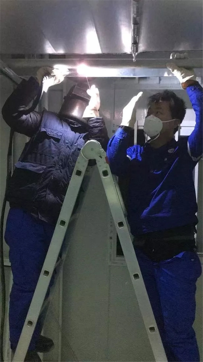 “火神山醫院每層天花板內部空間小是小了一點,燒焊燒到上面的時候,人進不去,進不去就看不到焊縫。于是,我們就在旁邊支架上,固定一塊小的反光鏡,對著鏡子繼續燒,這也是我們經常會用到的方法。其實,室內施工還算好的,雷神山醫院頂樓天臺相當于外場施工,聽說施工前一天晚上還下了大雨,可能會比較麻煩一些。”參與火神山建設的龔思帆說道。