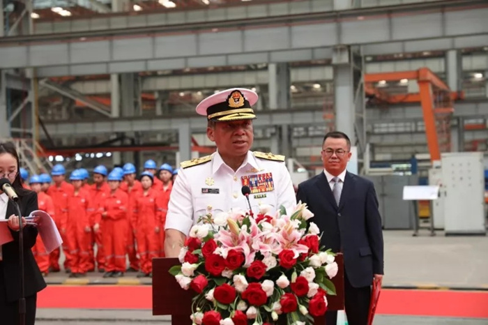 中船重工副總經理何紀武、馬來西亞皇家海軍司令卡瑪魯扎曼上將赴開工現場并致辭。卡瑪魯扎曼,何紀武,莫實德船廠總裁拉姆利,國防科工局軍貿與外事司副巡視員馬衛華,中船重工總經理助理、中國船貿黨委書記、董事長徐子秋,武船集團黨委書記、董事長楊志鋼共同觸摸水晶球,啟動切割指令。