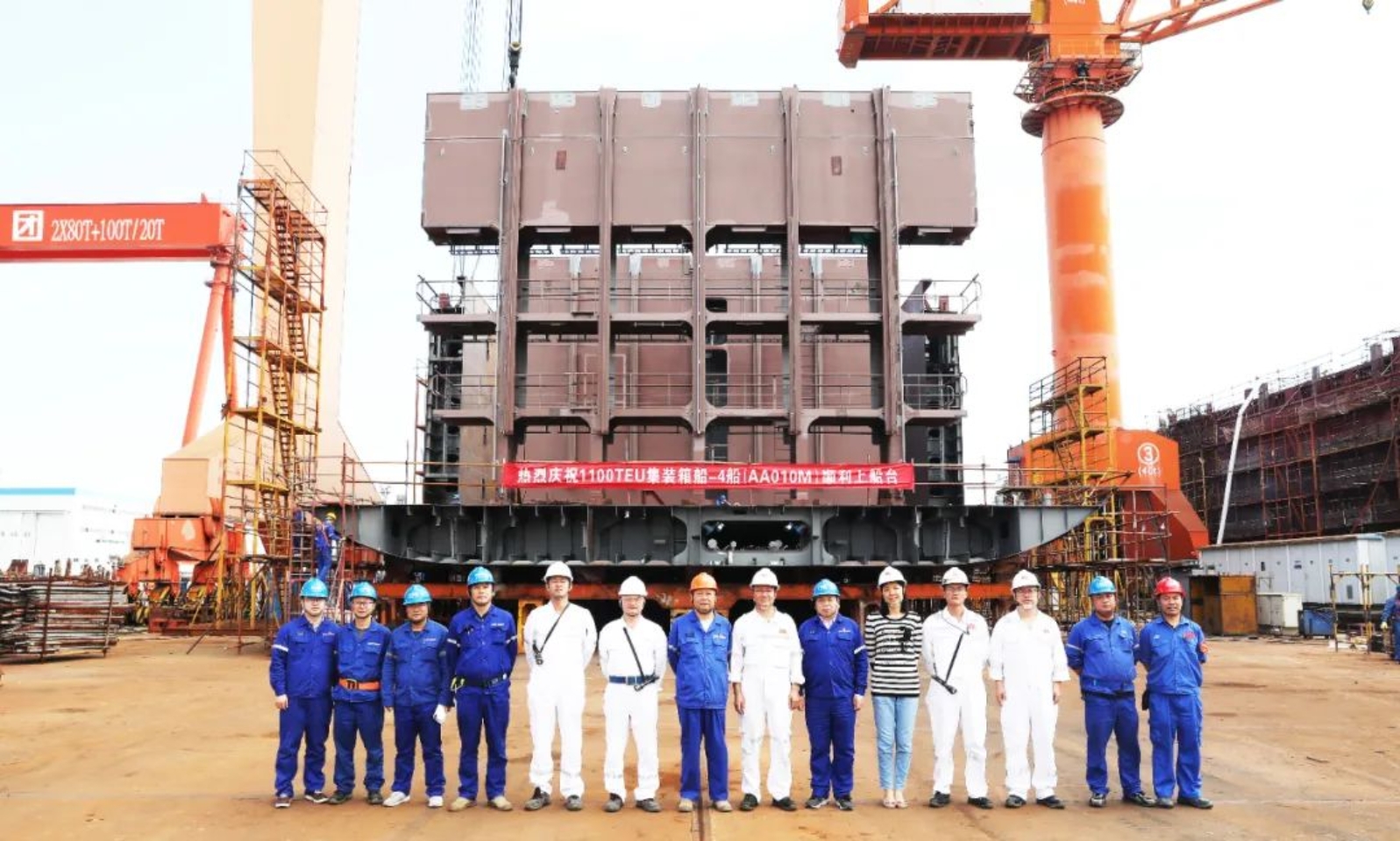 10月8日,由武昌造船承建的1100TEU集裝箱船4號船順利實現(xiàn)上船臺節(jié)點。至此該批一型四艘船最后一艘船正式轉(zhuǎn)入船臺搭載階段,為船舶順利交付奠定堅實基礎(chǔ)。船東、船檢及參建單位相關(guān)負責(zé)人參加儀式。